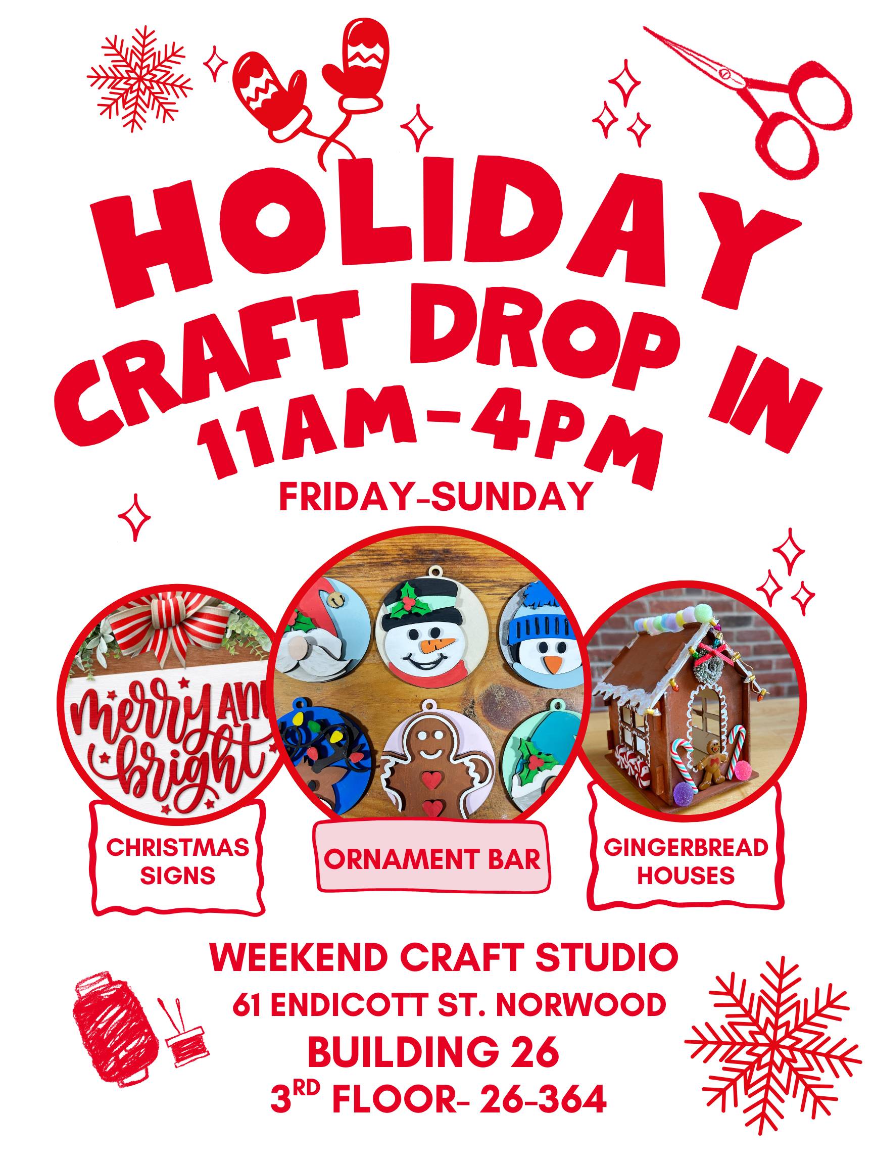 We are open today! Saturday and Sunday 11am-4pm to craft! Holiday Craft Drop-In Weekend ✨ DIY Ornament Bar Crafts start at just $3 and range up to $40, so there’s something fun for every age and budget. Come get your Christmas crafting started while supporting a small, local business this holiday season. ❤️ No need to RSVP but if you are looking for a reminder in your calendar you can RSVP on Eventbrite! Each craft will be individually priced in studio.